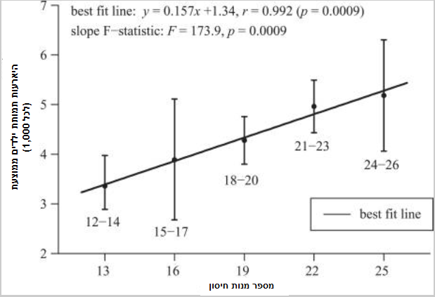 בנוסף להשוואת המדינות השונות, קיבצו החוקרים את המדינות לחמש קבוצות לפי מספר מנות החיסונים הנהוגות בהן: החל מ 12-14 מנות חיסון בקבוצה הראשונה ועד 24-26 מנות חיסון בקבוצה האחרונה. המתאם בין מספר מנות החיסון לשיעור תמותת התינוקות נשמר גם בחלוקה זו, כפי שניתן לראות בתרשים הבא: